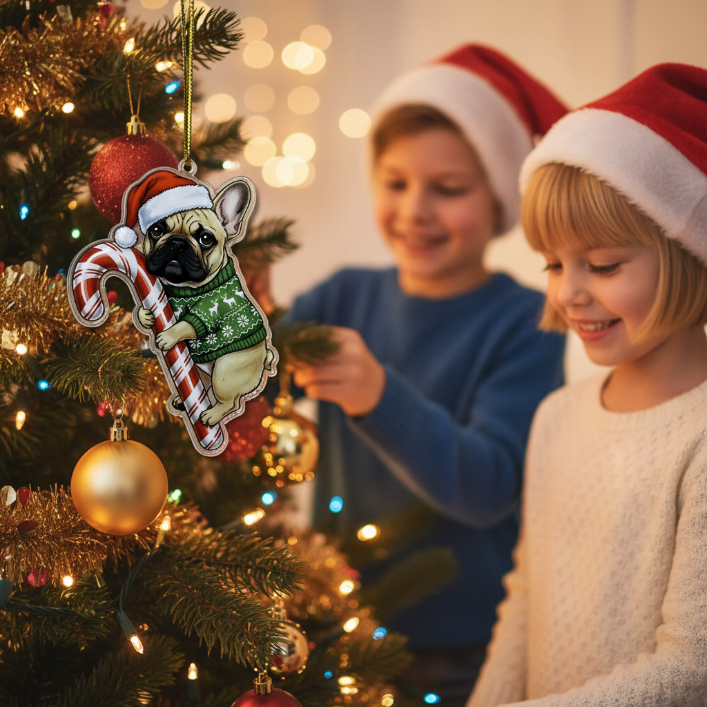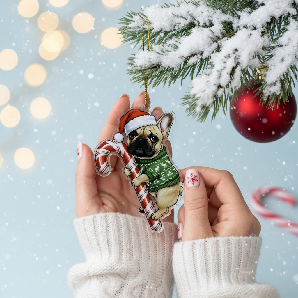Cute French Bulldog Dog Hugging Candy Cane 2D Flat Acrylic Ornament - Christmas Tree Decoration, Dog Lover Gifts 2025