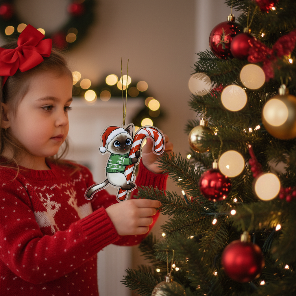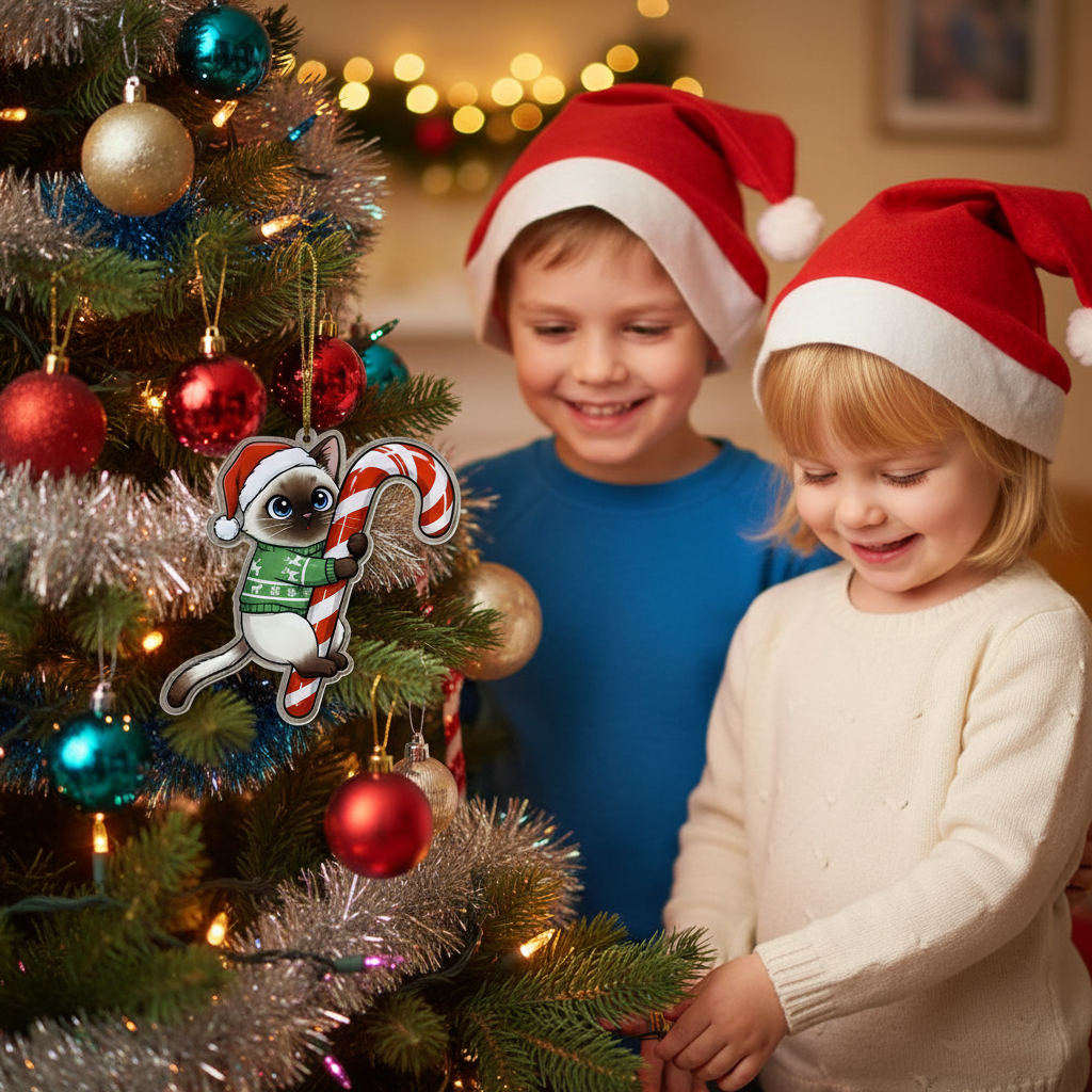 Cute Siamese Cat Hugging Candy Cane 2D Flat Acrylic Ornament - Christmas Tree Decoration, Cat Lover Gifts 2025